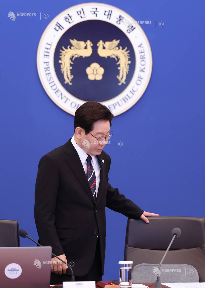 epa12892828 South Korea's President Lee Jae Myung (C) holds a meeting with his senior secretarie...