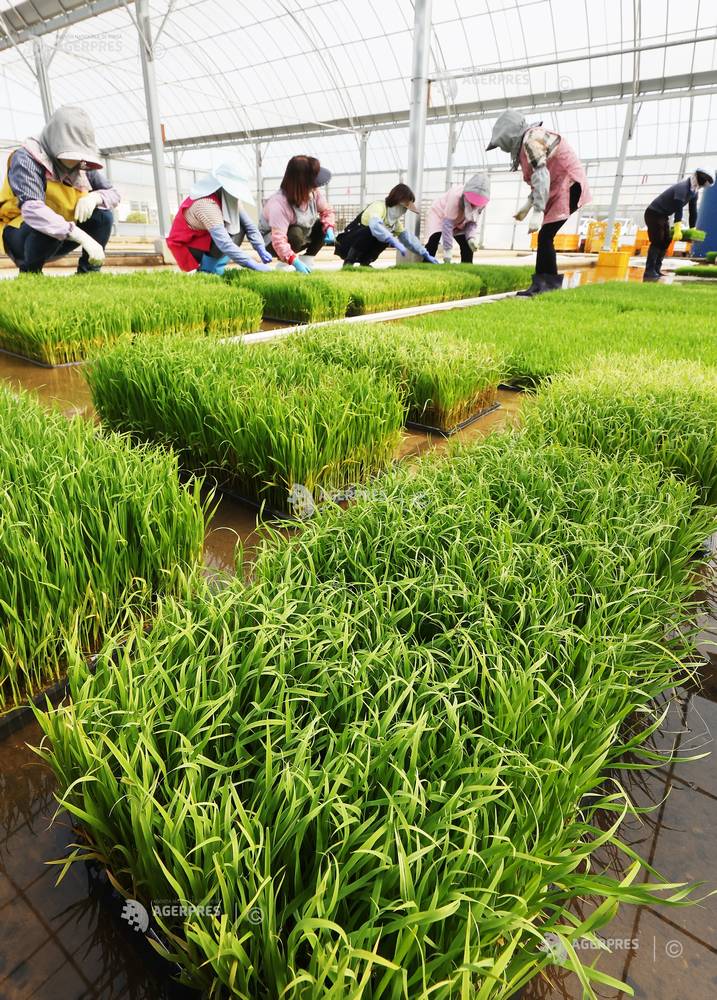 epa12892887 Employees tend rice seedlings at a nursery operated by the state-run National Institu...