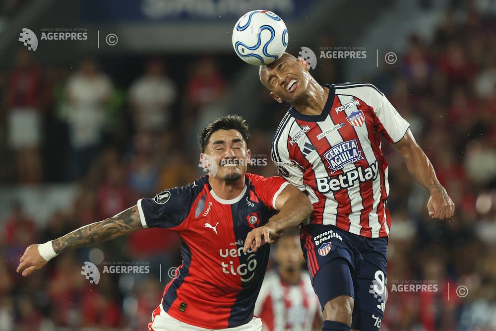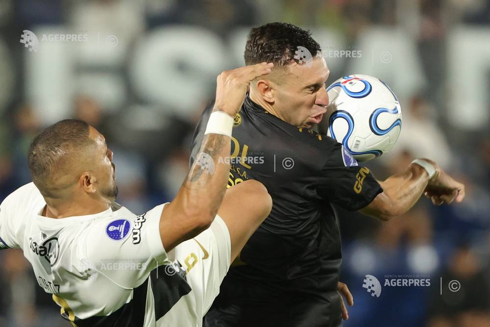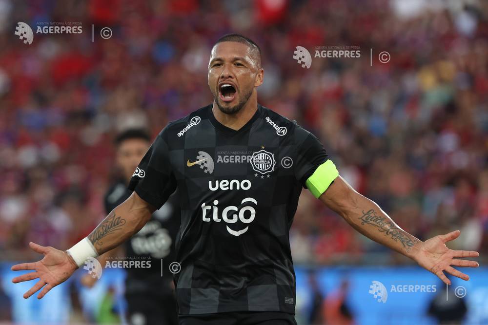 epaselect epa12892802 Richard Ortiz (L) of Olimpia vies for the ball with Norberto Briasco of Barracas Central during a CONMEBOL Sudamericana between Olimpia and Barracas Central at the Defensores del Chaco stadium in Asuncion, Paraguay, 15 April 2026. EPA/Juan Pablo Pino