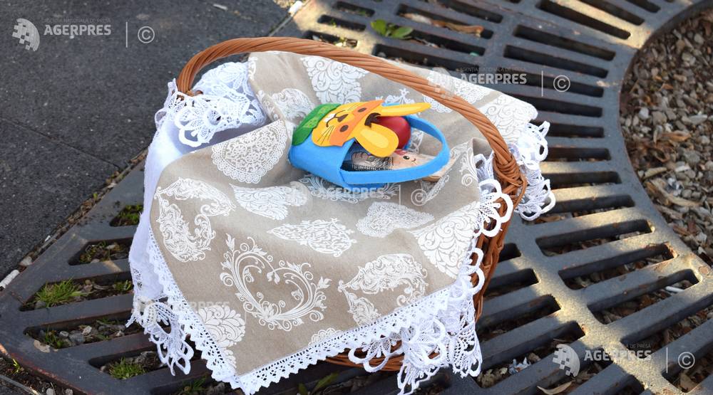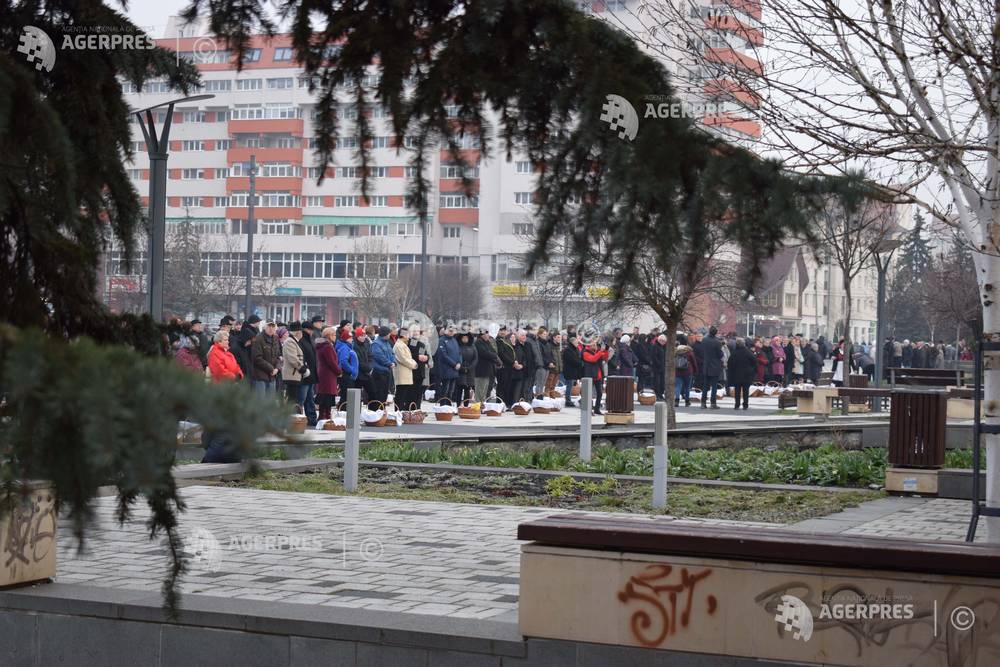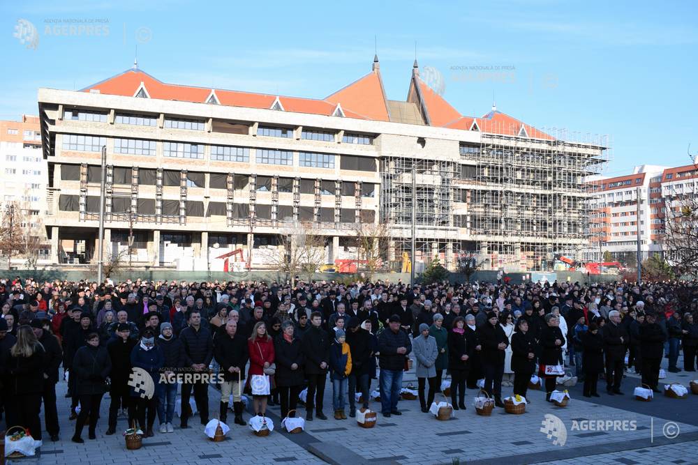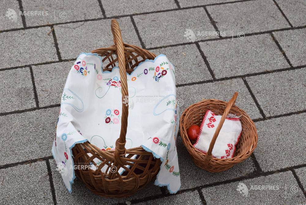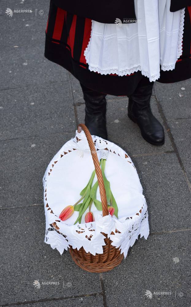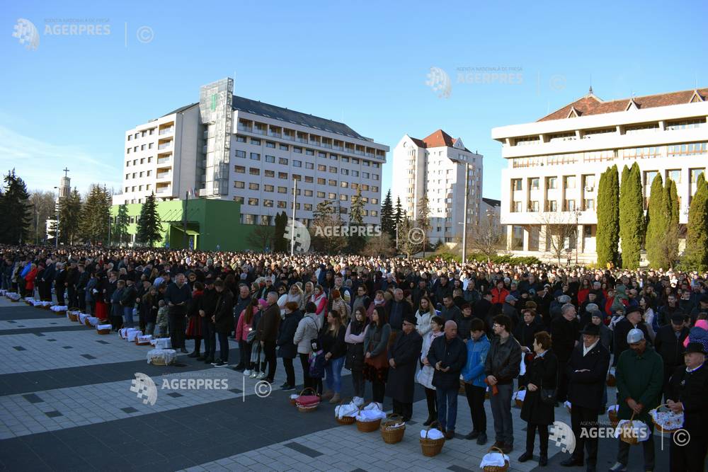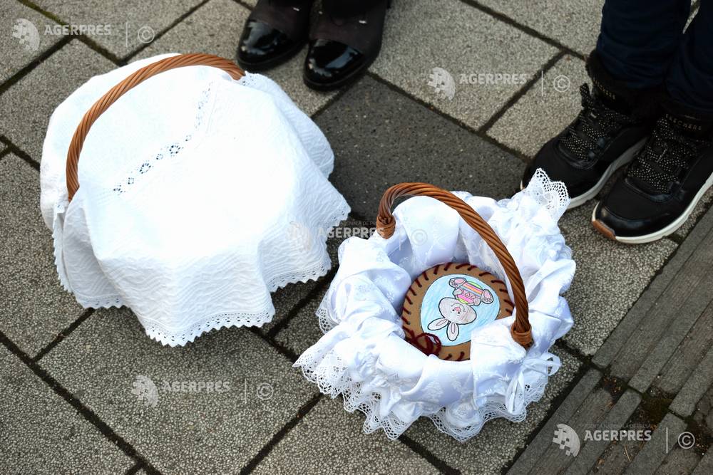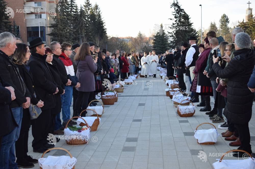 Traditionalul ceremonial de sfintire a bucatelor din prima zi a Pastelui Catolic, organizat in centrul municipiului Miercurea-Ciuc.